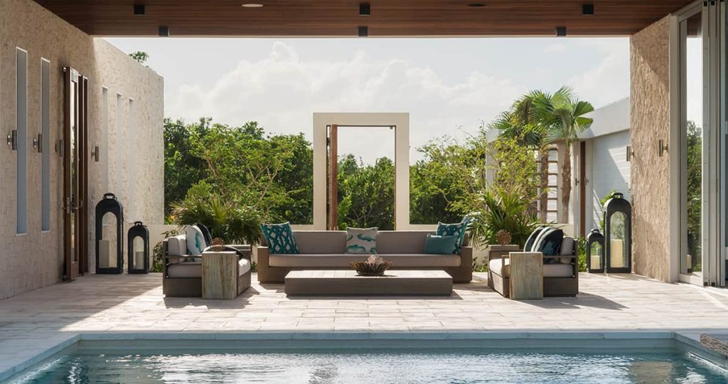 The pool deck offers al-fresco seating throughout, including lounging sofas, sun chairs, a poolside daybed and a fire pit. There is an outdoor kitchen with a wet bar and large 42” gas barbecue.