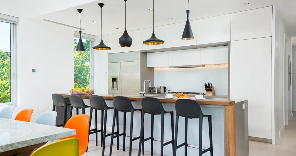 The living, dining and kitchen area combine for one large ‘Great Room’ that creates a comfortable, social setting that seamlessly opens up to the exterior pool deck via large 11’ Italian glass sliding doors.