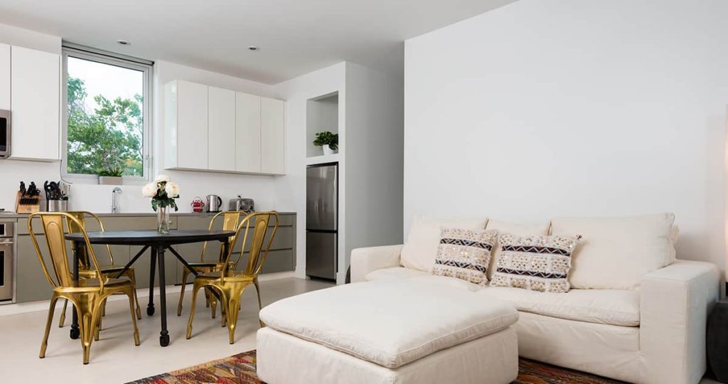 La sala, el comedor y la cocina se combinan en una ‘Gran Área’ que crea un ambiente cómodo y social y que se abre de manera fluida a la terraza con piscina externa mediante grandes puertas corredizas de vidrio italianas de 11’.