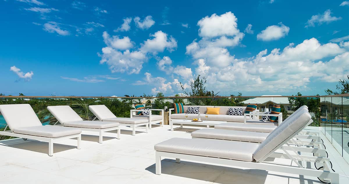 - Upper, Open Air Balcony with Lounge Seating and Umbrellas