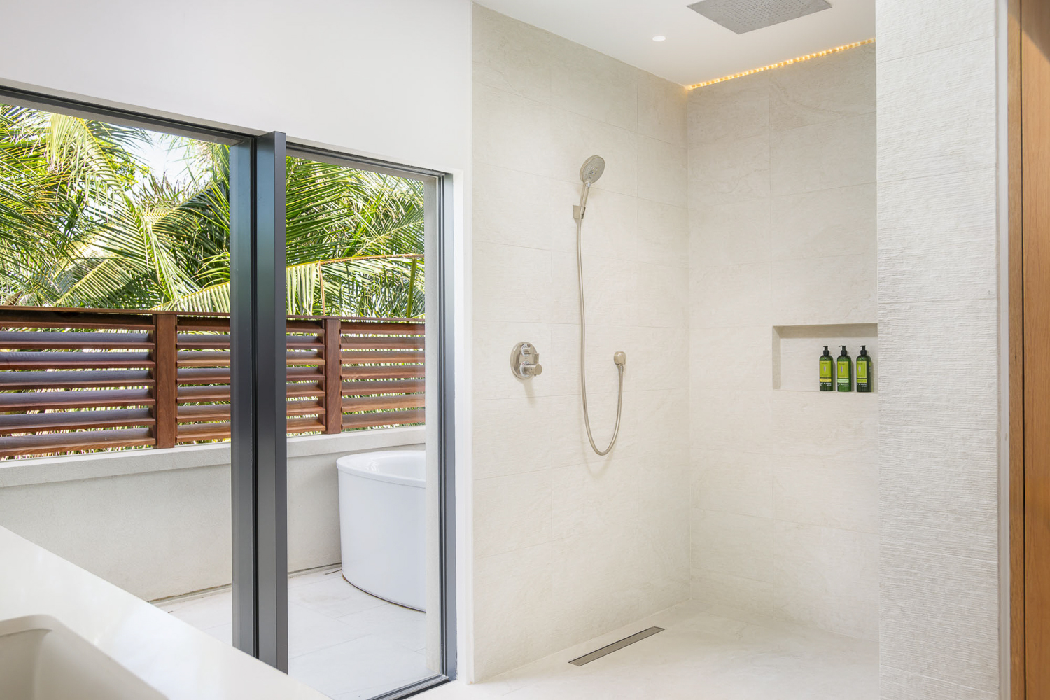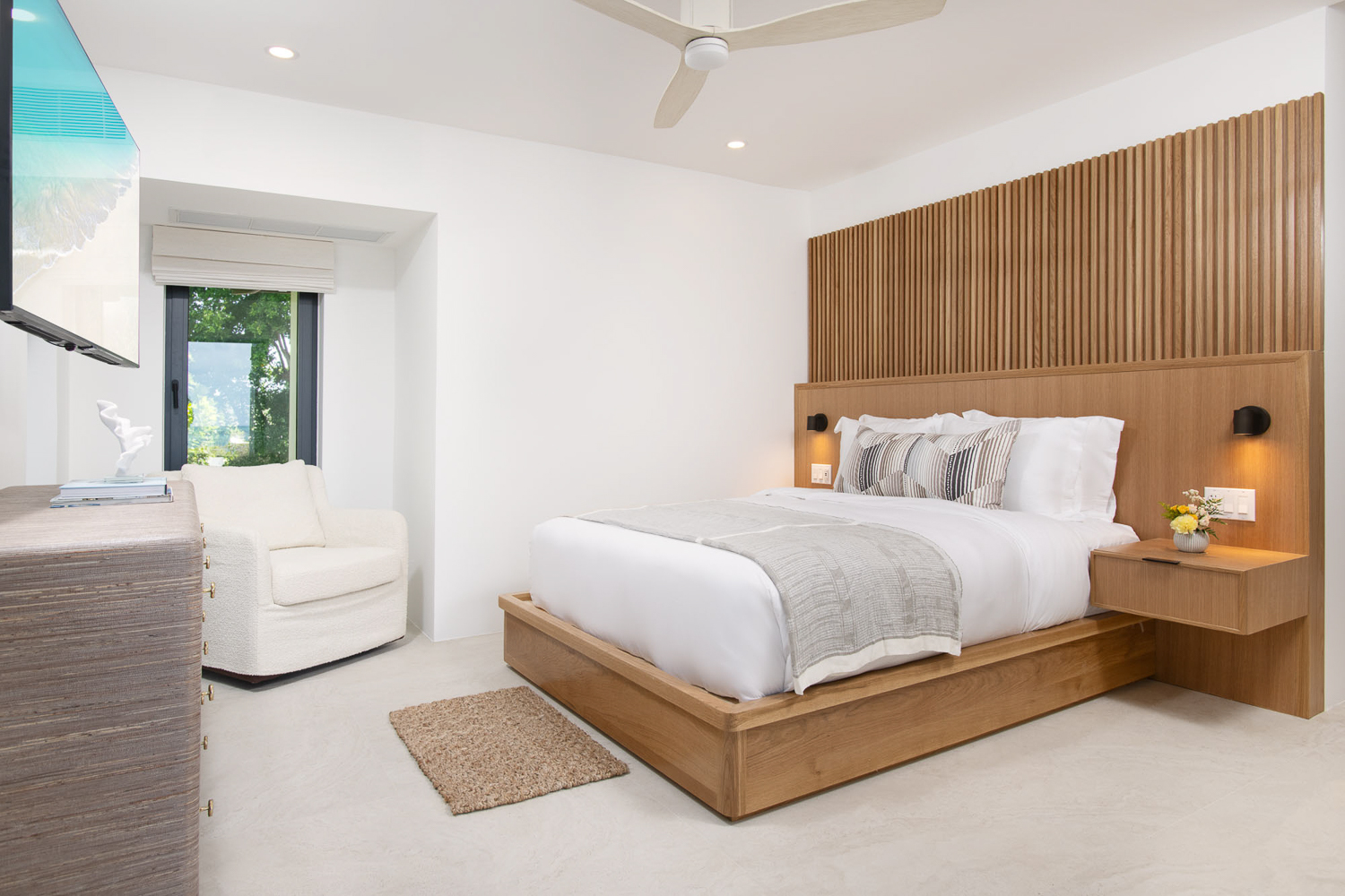 A king-size bed with third-level frontal views of the pool deck, beach, and ocean, a large 5′ cumaru wood balcony, an outdoor shower, blackout drapery, a large 55″ flat-screen TV, a spacious ensuite bathroom, and its own thermostat for AC control.