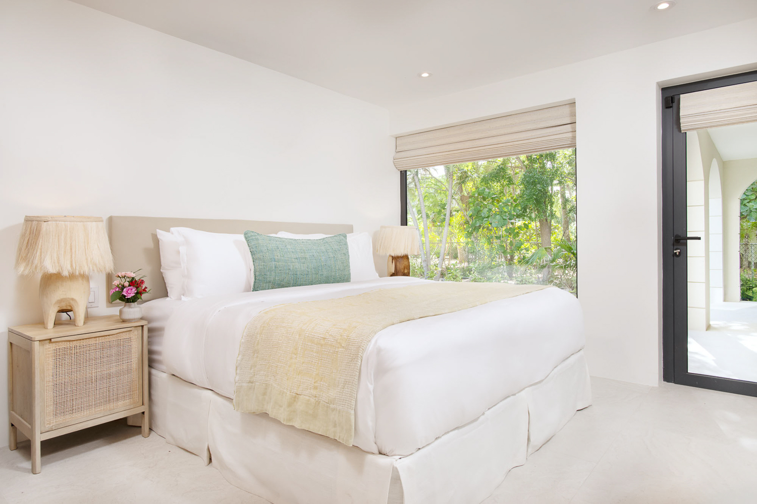 Equipped with two queen size beds, courtyard views of the lush gardens below and villa’s 1/2 basketball court. There is also blackout drapery, a large 55″ flat screen TV and large ensuite bathroom with stand alone tub. The suite has its own thermostat for AC control.